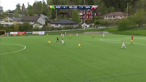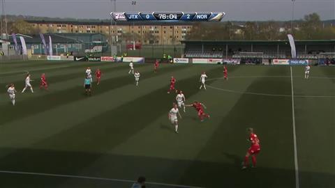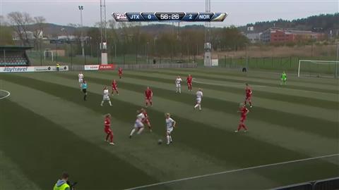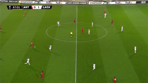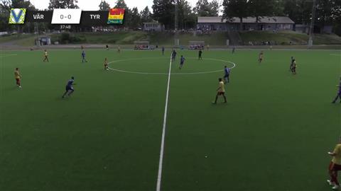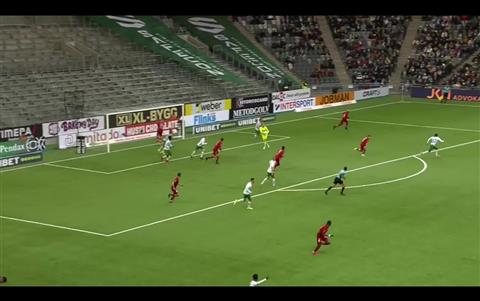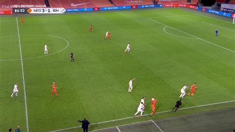 Omställning, fart, yta, medspelare i fördelaktig position = möjlighet till omedelbart lovande anfallFörsvararen stämplar den blå spelaren på foten, vilket domaren identifierar och ska därmed varnas nästa gång bollen är ur spel. Viktigt att hela teamet är uppmärksamma på numret på den felande spelaren. Utmärkt fördelshantering av domaren som varnar när bollen har gått ur spel.